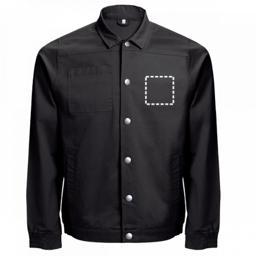 Мужская рабочая куртка. 98% хлопок и 2% спандекс: 240 г/м². Стилизованный воротник. 2 боковых кармана и 1 нагрудный карман. Частичная эластичная отделка манжетов и пояса. Застегивается с помощью заклёпок. 2 складки на спине. . Вид нанесения, рекомендуемый поставщиком: трансфер, текстильный принтер